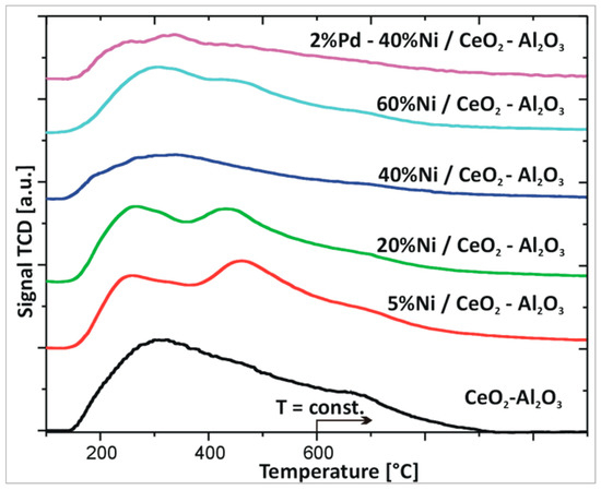 In the next step, the interaction between active phase component and support (CeO2–Al2O3) was investigated for the monometallic nickel and bimetallic Pd–Ni catalysts (see Figure 2B). The TPR profiles of nickel catalysts supported on CeO2–Al2O3 oxide showed four reduction stages in the reduction profiles independently from the nickel content. The TPR profile recorded for 5%Ni/CeO2–Al2O3 catalyst showed the first two reduction stages positioned at 300 and 430 °C which are assigned to the reduction of unbounded NiO species strongly interacted with support. The third reduction peak located in the temperature range of 500–650 °C is attributed to the reduction of surface oxygen species of CeO2 and Ni–O–Al linkage reduction. The last reduction stage is attributed to the reduction of CeO2 in bulk as well as to the reduction of spinel NiAl2O4 structure. TPR curve of 20%Ni/CeO2–Al2O3 system showed also four stages, which are related to reduction of the same oxides species. The first two reduction peaks are visible at 270 and 430 °C, respectively. The third effect is located in the temperature range of 480–600 °C while the last one is situated above 650 and is completed at 900 °C. Further increase of the Ni content in the catalytic systems did not change the reduction behaviour of the investigated nickel catalysts. The TPR profile of 40%Ni/CeO2–Al2O3 had the same shape as previously described for Ni catalysts. On the other hand, the TPR curve of 60%Ni/CeO2–Al2O3 catalyst exhibited the same reduction stages as for previously presented catalysts the only difference being the location of each effects and their intensity. In the case of the 60%Ni/CeO2–Al2O3 catalyst, the first two effects were visible at 250 and 400 °C and their intensity was significantly higher compared to previously described systems. The third effect was located in the temperature range 450–600 °C. The last high temperature effect (IV) connected with the reduction of CeO2 in bulk and the reduction of spinel NiAl2O4 structure was observed above 680 °C. The reduction process of monometallic Ni catalysts supported on CeO2–Al2O3 systems containing various Ce/Al ratios were investigated previously [33]. The authors reported that their reducible behaviour strongly depends on the catalyst composition. They also observed four stages of reduction of the studied catalysts on the TPR curves as in our case. The reducibility of Ni catalysts supported on CeO2, Al2O3, and CeO2–Al2O3 supports were also reported [50]. The authors also described several reduction peaks in the TPR curves recorded for supported catalysts connected with reduction of three types of NiO species (α, β, and γ). They also claimed that addition of CeO2 into Al2O3 weakens the interaction between the NiO and Al2O3.