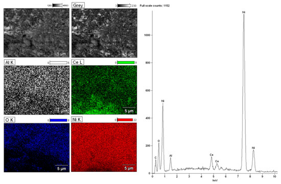 The magnification during the analysis of bimetallic catalytic system was 5000. The surface analysis performed for bimetallic catalyst showed the occurrence of nickel, aluminium, oxygen and palladium on the catalytic surface. Figure 9 presents the analogous measurements carried out for bimetallic catalyst supported on CeO2 after calcination at 400 °C in air atmosphere. The EDS spectrum collected form the surface confirmed the presence of nickel, cerium, and oxygen. The lack of palladium would suggest covering of this element by other catalyst components on the catalyst surface. In order to investigate the elemental composition of the catalyst, the same measurements were performed for bimetallic catalyst supported on binary oxide. The surface analysis of bimetallic Pd–Ni/CeO2–Al2O3 catalyst calcined at 400 °C in air showed similar results (see Figure 10). The only difference was the presence of aluminium on the catalyst surface. Additionally, the regions on which cerium and aluminium elements are present can be easily distinguished. This result can be explained by a specific interaction between CeO2 and Al2O3 oxides and could be confirmed by the reduction results obtained for the systems supported on CeO2–Al2O3 binary oxide.