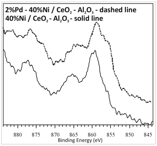 In order to elucidate the interaction between the active phase component and/or support the X-ray photoelectron spectroscopy analysis was carried out for monometallic Ni and bimetallic 2%Pd–40%Ni/CeO2–Al2O3 after reduction in a mixture of 5%H2–95%Ar at 500 °C. The XPS high resolution spectra of the binding energies between 844 and 884 eV show several characteristic peaks (see Figure 11). The peak in the region of 844–884 eV includes Ni2+ species (859 eV) and metallic nickel (856 eV). The typical position of the XPS bands which supports the presence of Ni2+ and Ni0 in the sample is 856 and 852.8 eV, respectively. The shift of the observed band assigned to the Ni2+ towards higher binding energy indicates that most of the nickel is in its oxidized or charged states. For our investigated catalysts the observed shifts of the specific bands are connected with the interaction which take place between NiO and Al2O3 or CeO2 monoxides. This result confirmed the observed reduction profiles on the TPR–H2 curves recorded for monometallic and bimetallic catalysts supported on the CeO2–Al2O3 binary oxide system. Luisetto et al. [55] studied Ni catalysts supported on the CeO2–Al2O3 system by XPS. They reported complicated Ni 2p spectra due to the presence of high binding energy satellites. The calcined sample showed the main peak positioned at a binding energy of 854 eV which was attributed to the Ni2+ species. The shift of this peak related to the typical signal positioned at 856 was explained by the high interaction with the support. The XPS analysis performed by the authors for reduced catalyst showed the characteristic band assigned to the metallic nickel at lower binding energy values of Ni 2p3/2 = 853.0–853.5 eV. The observed shift can be associated with the partial oxidation of the sample before the real measurement.