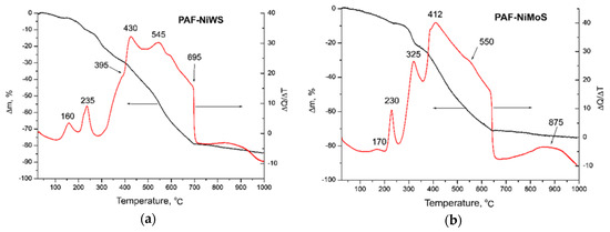 Differential thermal analysis (DTA) and thermogravimetry (TG) plots for (pores of mesoporous aromatic frameworks) PAF-NiWS (a) and PAF-NiMoS (b) catalysts.