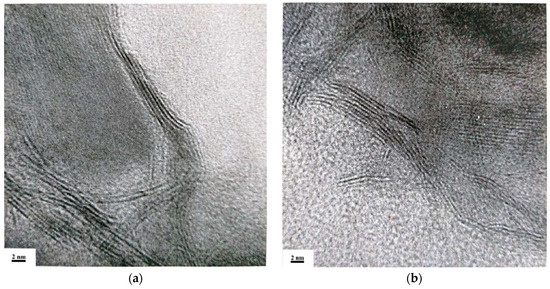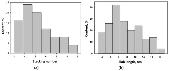 High-resolution transmission electron microphotographs (HRTEM) of particles of the PAF-NiWS catalyst, after the reaction of LCO hydroconversion, are seen in Figure 2. Such lamellar structures of particles, that consist of multiple layers, are typical for sulfide catalysts. Analogously to the previous work [14], the length, L, and the number, N, of three-dimensional stacked layers were measured (Figure 3). The stacking number for the PAF-NiWS catalyst varied from three to nine with a maximum of four to five slabs. The slab length varied from 3 nm to 19 nm with a maximum of 7 nm.