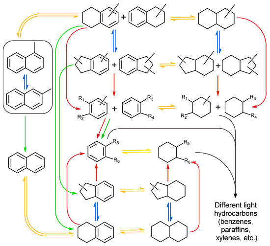 Scheme of hydroconversion of methylnaphthalenes. Yellow arrows—hydrogenation reactions; red arrows—hydrocracking reactions; blue arrows—isomerization reactions; green arrows—dealkylation reactions.