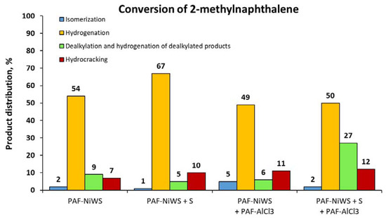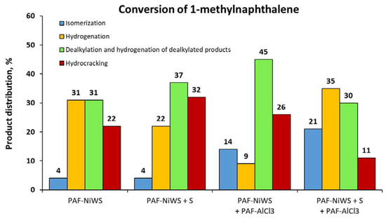 The results of hydrotreating of 1- and 2-methylnaphthalenes over the PAF-NiWS catalyst are presented in Figure 7 and Figure 8. 2-Methylnaphthalene underwent conversion to methyltetralines and methyldecalines—hydrogenation reaction products. The introduction of both sulfur and PAF-AlCl3 dramatically accelerated the rate of the dealkylation process and, to a lesser extent, the rate of the hydrocracking processes. In the case of experiments with 1-methylnaphthalene, the yields of products of isomerization, dealkylation and hydrocracking reactions were higher than in the case of 2-methylnaphthalene. The introduction of PAF-AlCl3 accelerated the isomerization of 1-methylnapthalene into 2-methylnaphthalene.