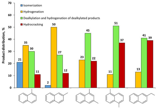 All reactions can be formally divided into four types: Hydrogenation reactions, also called hydrodearomatization reactions; isomerization reactions; hydrocracking reactions, which result in the destruction of C–C bonds in the carbon structure of molecule and the formation of new C–H bonds; and dealkylation reactions, which result in the destruction of C–C bonds between carbon atoms of the benzene ring, and the alkyl chain, and removal of the alkyl substituent from the structure of the molecule. Dealkylation reactions always result in a decrease in the number of carbon atoms in the molecule structure, while cracking reactions do not. For each molecule, the probability of entry into a particular type of the reaction depends on its structure, concentration, the activity of the catalytic system in this type of reaction, and other factors. It should be noted that the scheme in Figure 6 represents the main processes that occur during the hydrotreating of methylnaphthalenes, but does not include intramolecular condensation and transalkylation, coke formation and other side reactions.