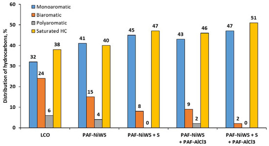 Distribution of aromatic hydrocarbons in the products of LCO conversion over PAF-NiMoS.