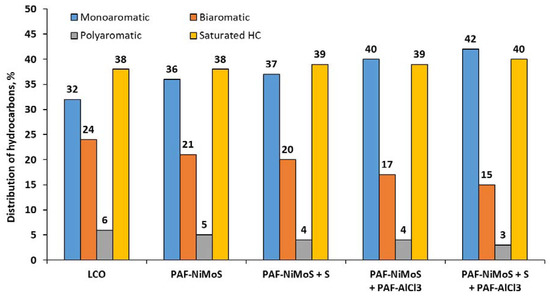 The use of the catalytic system PAF-NiMeS/PAF-AlCl3 could be most promising for hydrotreating LCO from the position of both hydrodearomatization, hydrocracking, hydroisomerization and hydrodesulphurization reactions. LCO contains a large number of aromatic compounds, mostly diaromatic (35–55 wt %) and monoaromatic (10–35 wt %) hydrocarbons, and to a lesser extent polyaromatic hydrocarbons (5–10 wt %) with three or more benzene rings in the structure [34]; the predominant diaromatic hydrocarbons are represented basically by different alkyl-substituted naphthalenes. The source of sulfur in LCO is various benzothiophenes and dibenzothiophenes, as well as disulfides in trace amounts. Depending on the fractional distillation temperature range and the feedstock and features of the manufacturing process, the content of the components in LCO could vary. LCO, which was used in the current work, is characterized by a high content of aromatic compounds (approximately 60 wt %). However, the distribution of mono- and diaromatic hydrocarbons was shifted towards the former. The sulfur content in the used feedstock was 0.35 wt %, or 3500 ppm, which is common for LCO.