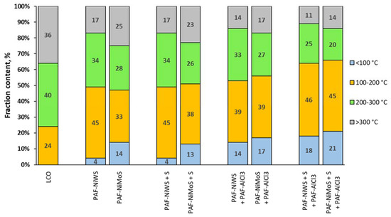 Fractional composition of LCO after hyrdoconvertion with PAF-NiMeS catalytic systems is shown in Figure 12. The use of the PAF-NiWS catalyst, as well as of PAF-NiMoS catalyst, led to the displacement of the fractional composition of LCO towards lighter products. However, tungsten catalysts were more effective for the conversion of “heavy” fractions, especially of fractions that boil above 300 °C. The addition of sulfur did not lead to a significant change in the distribution of fractions, confirming its role as a promoter in hydrogenation reactions. In contrast, when the cracking-promoting additive PAF-AlCl3 was added to the reaction, more light hydrocarbons were formed. Combining data of the fractional composition of hydroconverted LCO and the distribution of aromatic hydrocarbons in it, it can be concluded that in the presence of tungsten catalysts, the reaction proceeds by hydrogenation of aromatic substances followed by their hydrocracking. At the same time, in presence of molybdenum catalysts, the reaction proceeded through hydrocracking and dealkylation mechanisms, and PAF-AlCl3 promoted the hydrocracking of heavy aromatics.