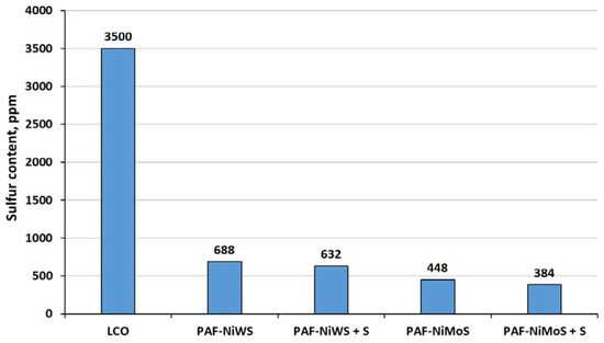 In addition, we determined the sulfur content in LCO after the reactions to assess the hydrodesulfurization activity of the catalysts (Figure 13). Hydrotreating over both tungsten and molybdenum catalysts allowed us to achieve a high level of desulfurization, reducing the sulfur concentration up to 10–20% from the initial content. The best results were obtained for the molybdenum catalyst PAF-NiMoS, for which the extent of desulfurization reached up to 90%. The use of tungsten catalysts made it possible to decrease the sulfur content to a level of 630–690 ppm, which could be explained by the lower activity of tungsten catalysts in hydrodesulfurization reactions compared to molybdenum catalysts [35,38].