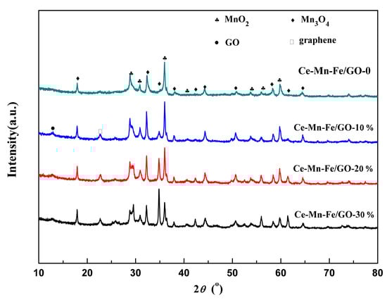 The XRD patterns of Ce-Mn-Fe/GO-x (x = 0, 10%, 20%, 30%) catalysts are shown in Figure 1. All of the samples show characteristic diffraction peaks of MnO2 and Mn3O4 in the patterns. Nevertheless, few weak peaks of crystalline Fe and Ce oxides are detected in the XRD patterns, indicating that all the Fe and Ce oxides have a fine grain size and exist in an amorphous form. The characteristic diffraction peaks of graphene, at approximately 20–25° in the results, are found in Ce-Mn-Fe/GO-x (x = 10%, 20%, 30%), suggesting that the graphene structure was successfully synthesized, and the peak of GO, at approximately 2θ = 13°, is also detected by a Bruker D2 PHASER diffractometer.