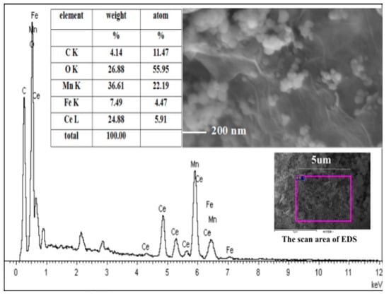 In order to further identify the composition and content on the surface of all the samples, the EDS of Ce-Mn-Fe/GO-20% was selected, and the results are shown in Figure 2. Ce-Mn-Fe/GO-0, Ce-Mn-Fe/GO-10% and Ce-Mn-Fe/GO-30% are shown in Figures S1–S3 in the Supporting Information, respectively. It can be seen, from all of these Figures, that the catalysts present the contents of Fe, Ce, Mn and O elements on the GO carrier. That is to say, there were no visible phases of Fe and Ce oxides in the XRD patterns, indicating that all of the Fe and Ce oxides were highly dispersed over the support, with a low content. The EDS proves the existence of Fe and Ce oxides on GO.