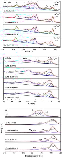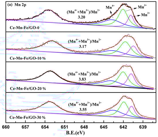 The XPS spectra of the samples were performed to further illustrate the chemical composition and the valence states of Mn, Ce and Fe. The results are exhibited in Figure 3, the Mn 3d spectra with two main peaks, corresponding to Mn 2p3/2 and Mn 2p1/2, are observed in Figure 3a. The Mn 2p1/2 peak consists of three sub-peaks, the corresponding binding energy of Mn3+ is 641.8 eV, and the peaks at about 642.4 eV, 641.2 eV, and 640.2 eV are Mn4+, Mn3+ and Mn2+, respectively. The rate of (Mn4+ + Mn3+)/Mn2+ was usually considerable for Hg0 oxidation, based on article []. The high valence Mn oxides enhance Hg0 oxidation efficiency, as Mn4+ can directly oxidize the adsorbed Hg0, and Mn3+ also has potential activity in Hg0 oxidation in the presence of O2. Manganese oxides exist at the mixed states of Mn4+ and Mn3+ in the four composition catalysts of Ce-Mn-Fe/GO-x (x = 0, 10%, 20%, 30%). In particular, the Ce-Mn-Fe/GO-20% possesses a higher Hg0 oxidation efficiency than other catalysts of Ce-Mn-Fe/GO-x (x = 0, 10%, 30%), and the main reason may be that the highest ratios of (Mn4+ + Mn3+)/Mn2+ are in the Ce-Mn-Fe/GO-20% sample, which plays an important role in Hg0 oxidation. In addition, the catalyst has quite a high content of Mn4+ and Mn3+ on the surface and it shows good activity in NOx reduction with NH3 at low temperatures [].