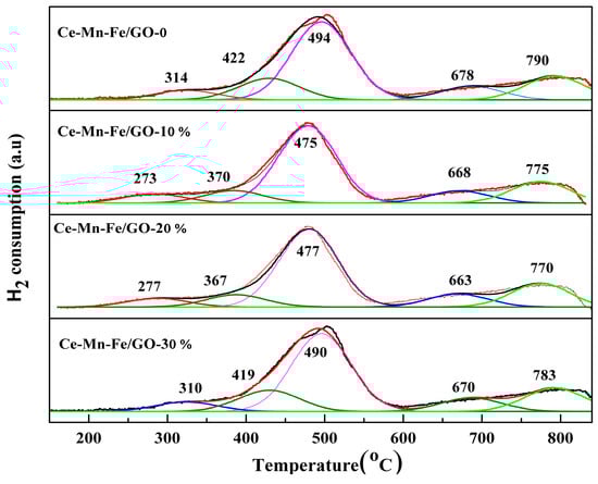 The reducibility of the prepared catalysts of Ce-Mn-Fe/GO-x (x = 0, 10%, 20%, 30%) was detected by H2-TPR in the temperature range of 100–900 °C, and the results are shown in Figure 4. For Ce-Mn-Fe/GO-0, the peak at around 314 °C can be attributed to the reduction of a highly dispersed MnO2 to Mn3O4. In addition, the higher two reduction peaks at 422 and 494 °C are the reductions of Mn2O3 to MnO and Fe3O4 to FeO, respectively [,]. The peak at 678 °C may be a reduction of CeO2 to Ce2O3 []. The peak above 750 °C was assigned to the reduction of surface FeO to Fe []. The sample of Ce-Mn-Fe/GO-10% shows three apparent peaks in the H2-TPR curves, and the reduction When compared with Ce-Mn-Fe/GO-10%, the reduction peaks of Ce-Mn-Fe/GO-20% shift to a lower temperature due to the increase of GO. Furthermore, Ce-Mn-Fe/GO-30% evidently has an increase in GO, and the reduction curves shift gradually towards a higher temperature, the main reason being that amounts of GO join together and lead to a decrease of reducibility of metallic oxides. Above all, the sample of Ce-Mn-Fe/GO-20% has higher redox ability, with moderate GO.