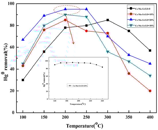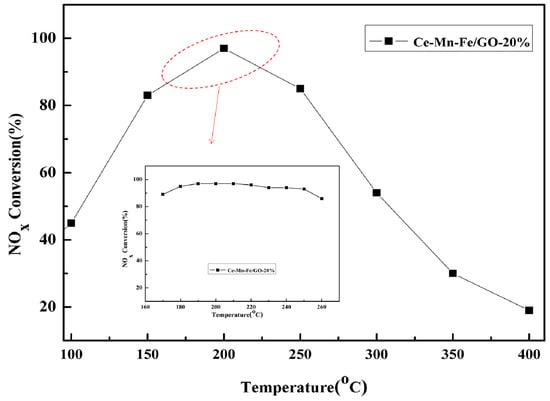 The Hg0 oxidation and NOx recondition efficiencies over Ce-Mn-Fe/GO-x (x = 0, 10%, 20%, 30%) were studied at reaction temperatures, with a range of 100 to 400 °C, and the results are shown in Figure 5. The catalysts of Ce-Mn-Fe/GO-x (x = 0, 10%, 20%, 30%) exhibit weak Eoxi, which is approximately 30%, 43%, 67%, and 45% at 100 °C, respectively. The efficiency at this temperature is mainly attributed to the physical adsorption and oxidation of Oβ on the surface of Ce-Mn-Fe/GO-x (x = 0, 10%, 20%, 30%) for Hg0 oxidation. The Eoxi increases with the increasing of temperature, and over 95% of Eoxi can be obtained at 170 °C for Ce-Mn-Fe/GO-20% and Ce-Mn-Fe/GO-30%. However, the value for Ce-Mn-Fe/GO-30% starts to decrease, when the temperature reaches 200 °C, and it continues to reduce in the range of 200 to 400 °C. Ce-Mn-Fe/GO-20% maintains the highest Eoxi, until the temperature reaches 250 °C, at which point it decreases rapidly until 400 °C. The samples of Ce-Mn-Fe/GO-0 and Ce-Mn-Fe/GO-10% exhibit the highest Eoxi, exceeding 87% at 300 °C and 83% at 220 °C, and the Eoxi decreases to about 62% and 22% at 400 °C, respectively. Comparing the four composites in relation to Eoxi, the sample of Ce-Mn-Fe/GO-20% shows an outstanding efficiency with a low temperature of 170 °C and when the temperature span is 80 °C (see the larger image in Figure 5). The reason is that metallic oxide particles uniformly load on GO with a large specific surface area, which is beneficial for Hg0 absorption and oxidation.