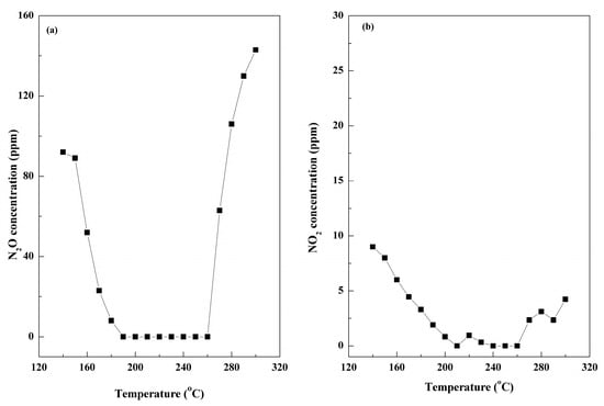 The N2O output concentration over Ce-Mn-Fe/GO-20% is shown in Figure 7a. This shows that nearly 100% N2 selectivity was obtained in the region of 180–250 °C over the catalysts. However, the N2O output concentration over Ce-Mn-Fe/GO-20% gradually increased with the rising temperature in the region of 280–300 °C, due to the produce of N2O, resulting from the gradual oxidation of NH3 at a high temperature. The changes of NO2 concentration in the region of 140–300 °C, indicating that there is almost no NO2 output, as shown in Figure 7b.