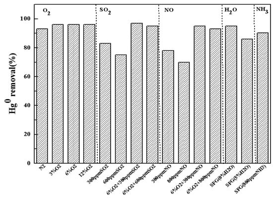 The effect of SO2 on Eoxi includes inhibition, promotion, and non-response. In our study, different concentrations of SO2 (300 ppm and 600 ppm SO2) were added into the pure N2 gas flow, and the result is demonstrated in Figure 8. The Eoxi decreases from 93% (pure N2) to 83% and 75%, with an SO2 concentration gradient of between 300 ppm to 600 ppm. SO2 has an inhibition effect on mercury removal. Besides, 6% O2 and 300 ppm SO2 were added to the mixer, interestingly increasing the Eoxi to 97%, and the result changes little when the concentration of SO2 changes from 300 ppm to 600 ppm. The reason is that the SO2 may not only directly react with O2 over the catalyst, but may also react with the lattice oxygen to form SO3, which can offer more acid active sites to oxidize the adsorbed Hg0 [].