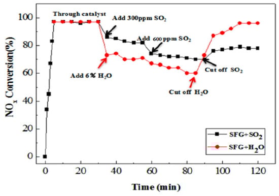 Additionally, the effects of SO2 and H2O have been explored, under operating conditions, on NOx removal, and the results were demonstrated in Figure 9. SO2 has an adverse effect on NOx removal when 300 ppm SO2 is included in the simulated flue gas (SFG), and η decreased from 97% to 83% and further decreased to 78% when the concentration of SO2 increased to 600 ppm. Then, cutting off SO2, the efficiency recovered slightly. The main reason is that the SO2 can combine with NH3 to form ammonium sulfate and cover the surface of the catalyst to inhibit the reaction, resulting in a decrease of catalytic activity. Water vapor presented an inhibitive effect on η over Ce-Mn-Fe/GO-20% when 6% of water vapor was added to the simulated flue gas, and η gradually decreased from 97% to 83%. The competitive adsorption between H2O and NH3 on the surface of the catalyst could account for the deactivation []. It is worth noting that the conversion can recover soon after cutting off the H2O injection.