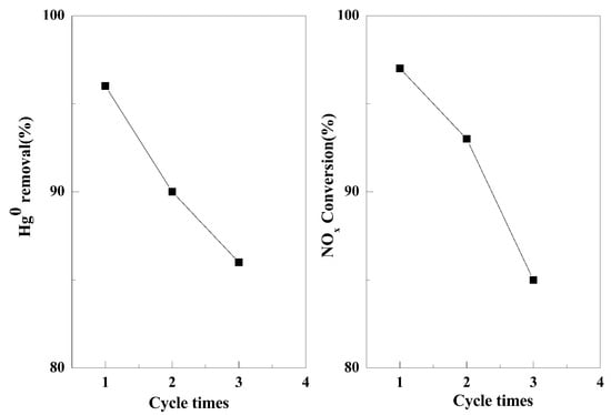 The most outstanding of the above samples is Ce-Mn-Fe/GO-20%. After 6 h, the Hg0 and NOx removal efficiencies reduced to 54% and 46%, respectively. To explore the active regeneration of the catalyst, the methods of heating to 400 °C in an atmosphere of nitrogen was employed. However, as Figure 10 shows, with the increase of cycling time, the Hg0 and NOx removal performance decreased slightly. After the third circulation, the regeneration capacity of Hg0 and NOx removal reached 85%, so that the regeneration capacity of Ce-Mn-Fe/GO-x highlights its potential applications in the future.