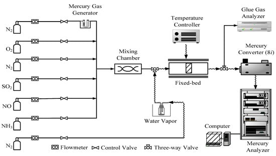 A lab-scale fixed-bed (the inner diameter, height, and thickness is 25 mm, 300 mm, and 2 mm, respectively) reaction system was assembled to evaluate the performance of the catalytic oxidation of Hg0, as shown in Figure 11. In each test, a 2.4 mL sample with a 40–60 mesh size was loaded in the reactor, which was placed in the center of a temperature-programmable electric furnace. A Hg0 permeation tube, loaded in a U-shaped glass tube, was used to generate Hg0 vapor carried by pure N2. The concentration of the Hg0 feed (45 μg·m−3) was provided steadily, and the concentration of Hg0 was measured while using a Thermo Fisher mercury continuous emission monitoring system (Hg0 CEMS). Other simulated gases, including NO, O2, SO2, H2O, and NH3, were introduced into the gas mixer at constant flow rates, controlled by mass flow controllers. The total flow rate was kept at 2 L/min for the accuracy of the experiment, and the calculated space velocity for the tests was 30,000 h−1. In every test, the mercury inlet gas stream bypassed the reaction bed and passed into the analytical system, until the desired inlet mercury concentration was established, and the reaction temperature was controlled from 100 to 400 °C by a temperature-programmed control. The outlet Hg0 concentration was measured at the condition of the gas flow, which was passed through the reactor. Hence, the Hg0 removal efficiency (Eoxi) was calculated according to Equation (6):