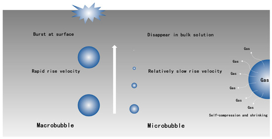 Microbubbles are defined as tiny bubbles with diameters of 10 to 50 μm [25,36], which are capable of large gas-liquid interfacial area and relatively low rise velocity [28] (Figure 1) and they have exhibited superior properties of physical chemistry and size effects [26]. It has already been used in the fields of environmental engineering [37], biomedical engineering [38], and other industrial productions [39,40]. The efficacy of this technology depends on both diameter distribution and number density of microbubbles [28]. Thus, further understanding of microbubble generation mechanism to obtain better efficacy is important.
