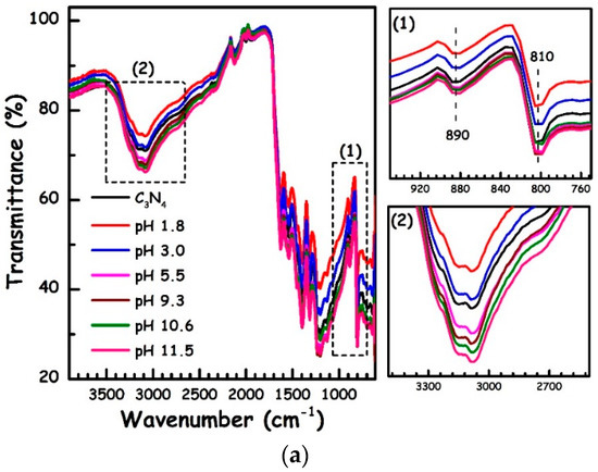 To further explore the composition of the hydroxyl-modified C3N4, FT-IR spectra were used, and plotted in Figure 2a. The peak located at 810 cm−1 was assigned to the typical breathing mode of a s-triazine ring, and the peak located at 890 cm−1 may be due to the out-of-plane bending mode of N-H. A bunch of peaks located at the range of 1200–1700 cm−1 were ascribed to the stretching vibration modes of C-N and C=N heterocycles. The broad peak at 3000–3250 cm−1 may have resulted from the N-H stretching vibration of uncondensed amine and hydroxyl groups [7]. It can be found that the intensity of this peak increased when the pH of the solution increased. This phenomenon may be due to more hydroxyl groups being adsorbed on the surface of C3N4 in a solution with a higher pH; and the amine groups being possibly dissolved in a solution with a lower pH during the hydrothermal treatment, resulting in the reduction of the intensity of this peak. This is also confirmed by the fact that hydrothermal treatment in a solution with a high pH favors the addition of more hydroxyls onto C3N4. Zeta potentials for the as-prepared samples (Figure 2b) were negatively shifted with an increase in the pH of the solution in the hydrothermal treatment. This suggests that the zeta potentials became more negative as the amount of hydroxyl groups increased. The more negatively charged surface of the catalyst favors the adsorption of organic pollutants in water, which improves the photocatalytic activity.