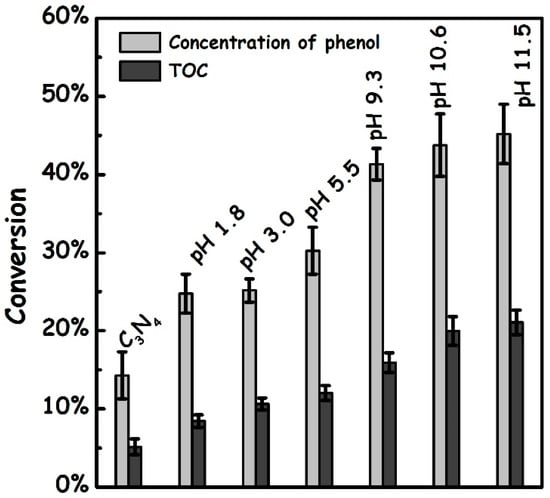 Photocatalytic conversion of phenol in the presence of g-C3N4 and modified g-C3N4 under visible light for 3 h. (pH in this figure represents the pH of the solution in the hydrothermal surface modification, each data point and error bar represents the mean and the standard errors, respectively, of independent triplicates).