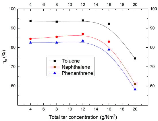 The effect of tar concentration on the destruction efficiency is presented in Figure 1. A destruction efficiency of 94.3% for toluene, 87% for naphthalene, and 83.5% for phenanthrene is obtained under a total flow rate of 12 NL/min, moisture concentration of 12%, and tar concentration of 12 g/Nm3, yielding an energy efficiency of 10.2 g/kW·h. The destruction efficiency decreases remarkably when tar concentration is over 16 g/Nm3, in contrast to our previous study of toluene and naphthalene (without phenanthrene) destruction, where the destruction efficiency has a high value at a tar concentration of 20 g/Nm3. This is because, as the experiment shows, phenanthrene addition tends to cause frequent breaking of the gliding arc, especially when both tar and moisture concentrations are high. Although the arc can be regenerated, the breaking decreases the destruction efficiency.