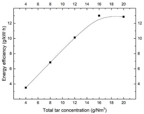Figure 2 shows that the energy efficiency increases as the total tar concentration increases until reaching 16 g/Nm3, after which the efficiency started decreasing. The instability of the reactor caused by the addition of phenanthrene is probably the factor that limits the maximum energy efficiency to 13 g/kW·h. The selectivity of C2H2 and CO rises monotonously with increasing tar concentration, while the selectivity of CO2 drops (Figure 3), though the absolute production of them as well as of H2 increases significantly as the tar concentration increases (Figure 4). The reason for this can be explained by water-gas shift reaction (Equation (1)) and reforming reaction of C2H2 (Equation (2)). The increase of tar concentration leads to the increase of CO and C2H2. The increase of CO and C2H2 promote the positive reaction of water-gas shifting and reforming reaction respectively, which increases the production of all the gas products. However, the concentration of H2O is constant, which limits the conversion rate of CO and C2H2 in the case of high tar concentration, leading to a high selectivity of CO and C2H2 while lowering the selectivity of CO2.