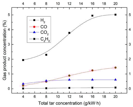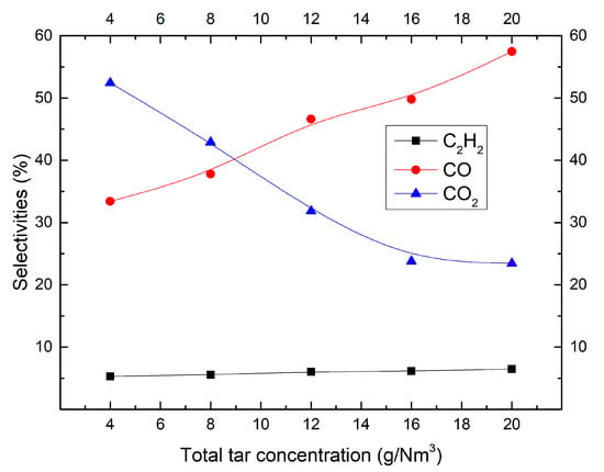 Effect of tar concentration on the selectivity of CO, CO2 and C2H2.
