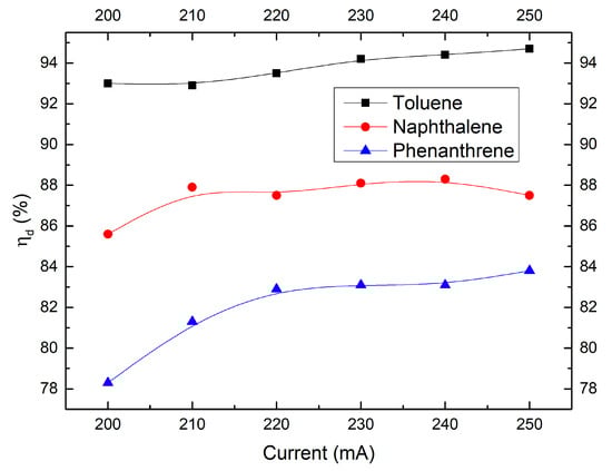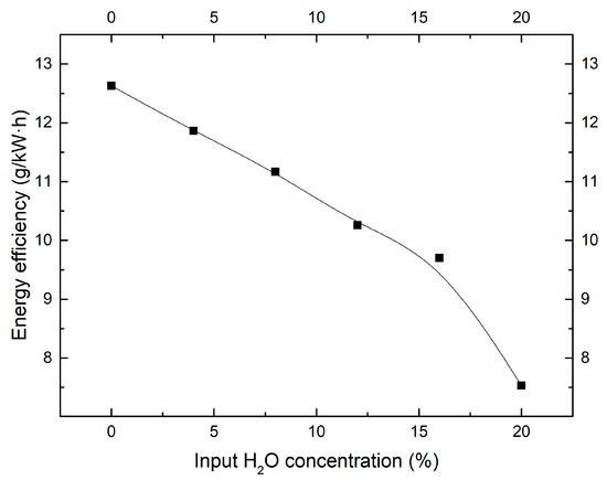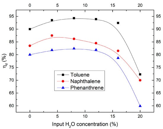 Figure 5 indicates that as the moisture concentration increases, the destruction efficiency of toluene, naphthalene, and phenanthrene increases first to a maximum at a moisture concentration of 8% or 12% and then starts decreasing. Previous studies by Zhu et al. [36] and Chun et al. [39] showed a similar phenomenon for the decomposition of tar surrogate using gliding arc. The proper amount of moisture facilitates the reaction because of the generation of OH radicals [40], while too much water has an adverse effect on tar destruction due to its electronegative characteristics, which limits electron density and quenches reactive species [30]. When the moisture concentration is up to 20%, the destruction efficiency declines suddenly because high concentration of moisture makes the reactor unsteady due to the existence of a high concentration of phenanthrene. The energy efficiency decreases linearly as the moisture concentration increases, as shown in Figure 6.