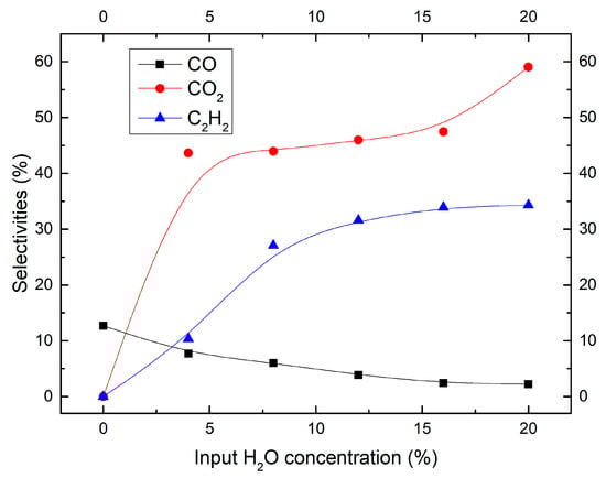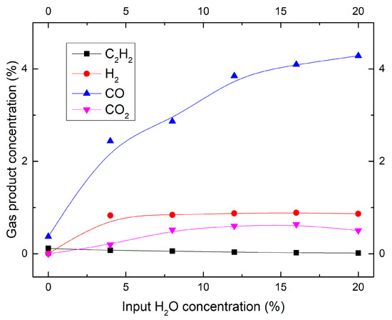 As Figure 7 presents, the selectivity of CO and CO2 increases with the increase of the moisture concentration, while the selectivity of C2H2 decreases because water brings oxygen to the reaction. The selectivity of CO, CO2, and C2H2 can be over 80% in total if enough water molecules are provided, and reach a maximum of 95% at a moisture concentration of 20%. However, the selectivity of C2H2 is 13% and selectivity of CO and CO2 is 0 under the dry conditions, which means most of the carbon element turns into black carbon in water deficient conditions. In addition, the increase of moisture concentration raises the hydrogen production remarkably, as presented in Figure 8. It is interesting to note that proper concentration can turn the production of solid carbon into gas, especially flammable gas like H2 and CO, which are highly desirable.