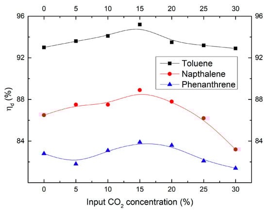 Figure 9 shows that with increasing CO2 concentration, the destruction efficiency of the toluene, naphthalene, and phenanthrene increases to a maximum at an input of 15% CO2 concentration, and then slightly reduced. Uncommon voltage waveform was observed under the condition with proper concentration of CO2, which can explain why the highest destruction efficiency is obtained in the atmosphere of 15% CO2. The voltage waveform is shown in Figure 10 under the condition with or without CO2. Compared with the typical condition without CO2, the waveform becomes regular in the condition of 10%–20% CO2. The voltage as well as the input energy have increased about 15% (from 1.80 kV to 2.07 kV of voltage), while the discharge current is the same. When the CO2 increases to about 25%, the waveform of voltage again becomes similar to the waveform without CO2 and the average voltage reduces simultaneously but remains higher than that in the condition without the participation of CO2. The role of oxidation of CO2 in destruction efficiency is slightly lower compared to H2O that can provide sufficient O atoms.