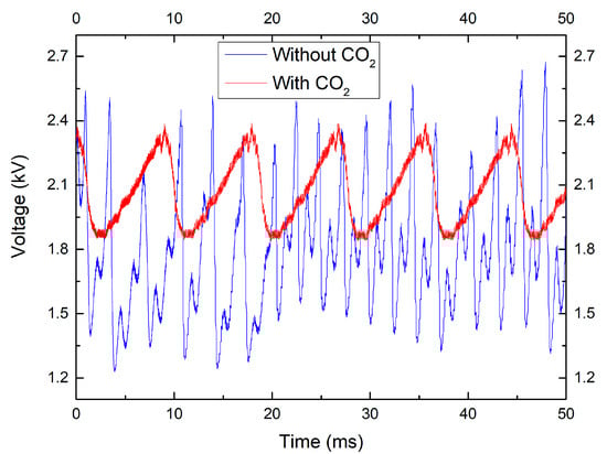 Voltage waveform of the discharge with 15% CO2 and without CO2.