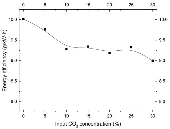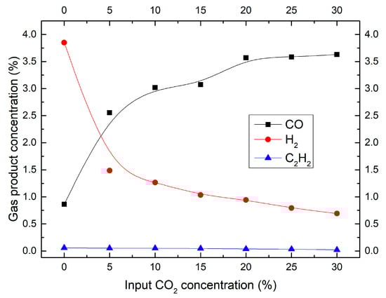 When the concentration of CO2 increases, the amount of CO in the product increases and the amount of H2 and C2H2 decreases because of the reverse reaction of water-gas shift reaction (Equation (1)) and the dry reforming reaction of C2H2 (Equation (3)). Although the components of gas production change a lot because of CO2, the heating value of the fuel after the reaction changes little because the production of CO increases while the production of H2 decreases. As shown in Figure 11, the negative effect of CO2 on the destruction is that it can reduce the energy efficiency of the reaction (Figure 12).