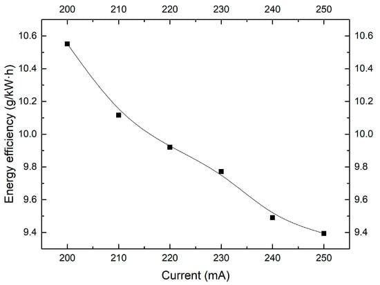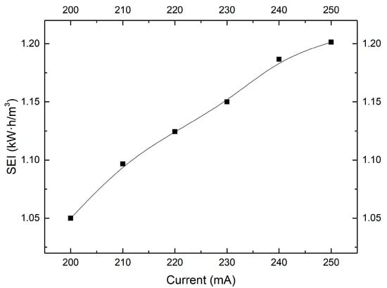 SEI goes up as the discharge current goes up, but less pronouncedly, because the voltage of the reactor decreases with increase of discharge current. The discharge current increases 25% (from 200 mA to 250 mA) while the SEI increases about 13% (from about 1.05 kW·h/m3 to about 1.20 kW·h/m3, as shown in Figure 17).