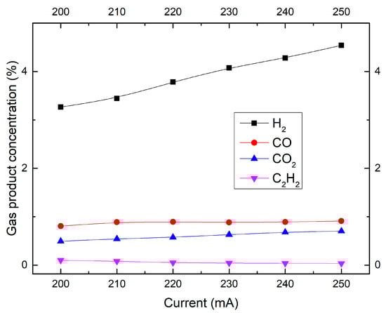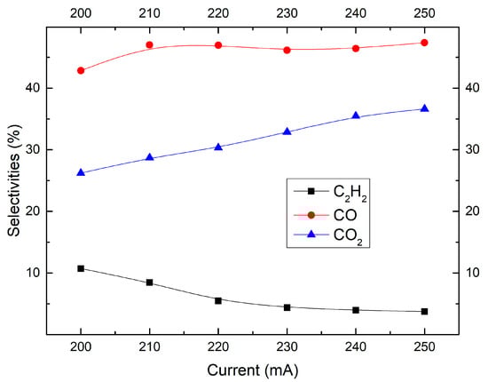 Effect of discharge current on the selectivity of C2H2, CO and CO2.