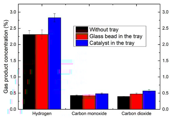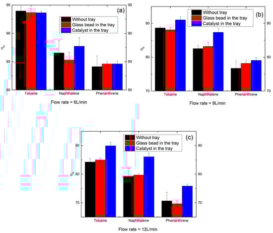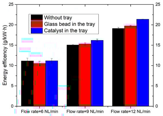 Figure 18 illustrates the influence of catalyst on destruction efficiency under different flow rates. The catalyst has little effect when the flow rate is relatively low (6 NL/min), as shown in Figure 18a. This is possibly because the destruction efficiency of plasma alone is so high that the amount of remaining tar is too low to involve in catalytic reaction. However, the catalyst reflects to be effective and improves the destruction efficiency remarkably under the flow rate of 9 NL/min and 12 NL/min. For instance, for a flow rate of 12 NL/min, the destruction efficiency of toluene, naphthalene, and phenanthrene increases to 90%, 86%, and 76% respectively, with the presence of the catalyst in the tray, from 85%, 80%, and 70% respectively with only glass beads in the tray (Figure 18c). The destruction efficiency in the condition of glass beads in the reactor is similar to that without a tray in the reactor according to Figure 18a–c, which indicates that the flow field changed by the tray contributes little to the change of destruction efficiency. In addition, the catalyst increases the energy efficiency when the flow rate is high, especially at a flow rate of 12 L/min, from 19.1 g/kW·h to 21.3 g/kW·h (Figure 19). As shown in Figure 20, the catalyst increases the production of gas products as well as destruction efficiency, indicating that the tar is definitely destroyed instead of being absorbed on the catalyst. The result illustrates that the Ni/γ-Al2O3 catalyst can be highly effective when single plasma cannot reduce the tar concentration to an ideal standard. As a result, plasma coupled with catalyst is worth using when the flow rate is high. It should be noted that a slight carbon deposition was observed on the catalyst after an operation of 1.5 h, which should be considered in the application of plasma catalysis.