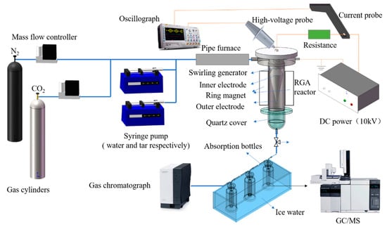 Schematics of the rotating gliding arc (RGA) assisted model tar destruction system.