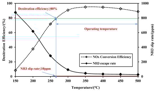 According to the working characteristics of the low-speed diesel engine SCR system, the exhaust gas temperature range was from 150 to 500 °C and the speed velocity was 10,000 h−1. And the main parameters of the catalyst used in the SCR system are shown in the Table 1. In addition, the concentration of NO, NO2, NH3, O2, and H2O were 900 ppm, 100 ppm, 1000 ppm, 15%, and 3%, respectively. Based on the SCR system model, this section simulated the change of the denitration efficiency of vanadium-based catalysts at different temperatures. The simulation results are shown in Figure 1.