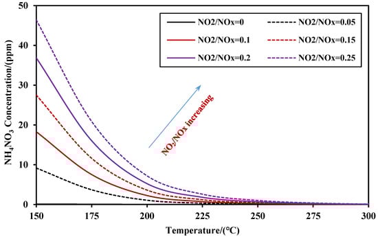 The influence of the reaction temperature and the NO2/NOx ratio on the NH4NO3 production and denitration efficiency were simulated in this section. According to the constructed chemical reaction model, NH4NO3 is easily formed at low temperatures. In addition, NO2 is the main reactant of NH4NO3 formation reaction and plays a great role in its formation. Therefore, considering the characteristics of NH4NO3 formation reaction, a speed velocity of 10,000 h−1 and a temperature range from 150 to 350 °C for the exhaust gas were adopted during the simulation. Moreover, the concentration of NH3, O2, H2O, and NOx were 1000 ppm, 15%, 3%, and 1000 ppm, respectively. Furthermore, the NO2/NOx ratio was 0, 0.05, 0.10, 0.15, 0.20, and 0.25, respectively and N2 was the equilibrium gas. The simulation results are shown in Figure 2 and Figure 3, respectively.