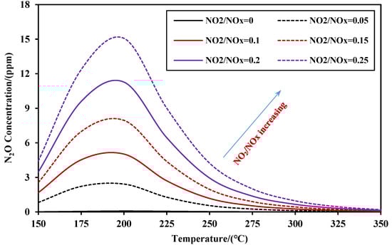 The generated NH4NO3 can clog the catalyst’s pores and surface, and it can also decompose into N2O, which reduce the denitrification efficiency to a certain extent. As shown in Figure 3, N2O concentration is increased and then decreases with the increase of reaction temperature, but the rise of NO2/NOx ratio is conducive to the formation of N2O. Conversely, at 200 °C and 0.25 NO2/NOx ratio, the amount of N2O reaches a maximum value of 15 ppm.