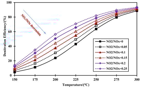 As shown in Figure 4, the denitration efficiency increases with an increase in the NO2/NOx ratio and in the temperature ranging between 175 °C and 250 °C—the former has the greatest influence on the denitration efficiency. Although increasing the NO2/NOx ratio can promote the progress of the denitration reaction, it is also necessary to consider the formation of a small amount of NH4NO3 and N2O at the low-temperature range.