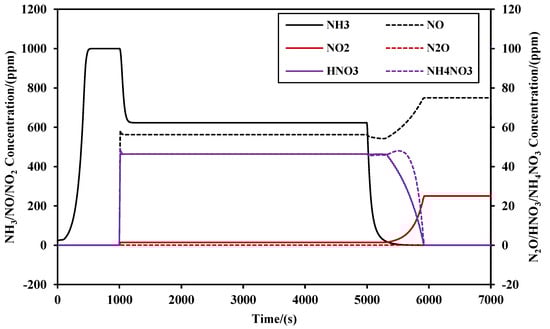 In order to analyze the ammonium nitrate passivation reaction process in detail, the simulation time was set at 7000 s. Only NH3 was introduced at the beginning and stopped at t = 5000 s, while NOx was introduced at t = 1000 s. According to the above section, the formation of NH4NO3 reaches its maximum value at 150 °C and 0.25 NO2/NOx ratio. Hence, a speed velocity of 10,000 h−1 and a NO2/NOx ratio of 0.25 were used during the simulation. In addition, the concentration of NH3, O2, H2O, and NOx were 1000 ppm, 15%, 3%, and 1000 ppm, respectively. Moreover, N2 was used as the equilibrium gas. The simulation results are shown in Figure 5.