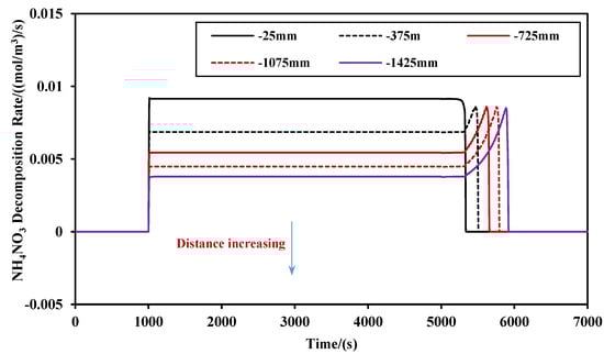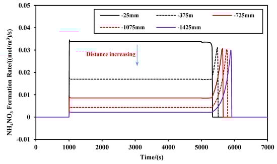 In order to further analyze the NH4NO3 formation process, five data points (25 mm, 375 mm, 725 mm, 1075 mm, and 1425 mm, respectively) before the reactor inlet were chosen in order to obtain the variation of NH4NO3 formation and decomposition reaction rate of each point with the charge of time. Simulation results are shown in Figure 6 and Figure 7, respectively.