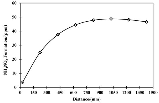 The relationship between the amounts of NH4NO3 produced before the reactor inlet and the distance (T = 150 °C, NO2/NOx = 0.25).