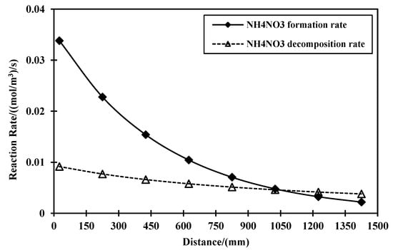 The relationship between the NH4NO3 formation and decomposition reaction rate before the reactor inlet and the distance (T = 150 °C, NO2 / NOx = 0.25).