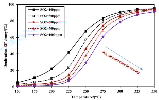 Figure 10 shows the relationship between the denitration efficiency and the SO2 concentration at different temperatures. It can be seen from Figure 10 that the denitration efficiency decreases with the increase of the SO2 concentration. Moreover, at 250 °C, a significant decline in the SCR denitration efficiency of 38% is observed as the SO2 concentration changes from 100 to 1000 ppm. However, the difference between the SCR denitration efficiencies decrease as the temperature increases, irrespective of the SO2 concentrations—both at the starting temperatures and the final temperatures. Likewise, when the temperature reaches 325 °C, the denitration efficiency is only 6% under the conditions of 100 ppm and 1000 ppm of SO2 concentration.
