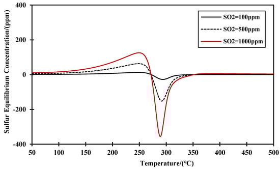 Figure 11 shows the relationship between the sulfur equilibrium concentration and the temperature at different SO2 concentrations. It can be seen from Figure 11 that the larger the SO2 concentration at the inlet of the reactor, the more the change in the sulfur equilibrium concentration. In addition, before 270 °C, the sulfur equilibrium concentration is positive and rises with the increase of the temperature, which can be seen at the different SO2 concentrations. Moreover, the peaks appear around 250 °C and their values increase with the increase of the SO2 concentration. Furthermore, when the temperature is between 270 and 350 °C, the sulfur equilibrium concentration is negative and the peak-peak is at around 290 °C with its value decreasing by an increase of the SO2 concentration. However, when the temperature reaches 350 °C, the sulfur equilibrium concentration is reduced to about zero, which means that the sulfur element is balanced at the inlet and the outlet of the reactor.