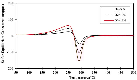 Figure 12 shows the relationship between the equilibrium concentration of sulfur and the temperature at different O2 concentrations. From Figure 12, the equilibrium concentration of sulfur increases with an increase in the concentration of O2. In addition, the maximum and minimum values appear at 15% O2 and these values are 62 ppm and −154 ppm, respectively.