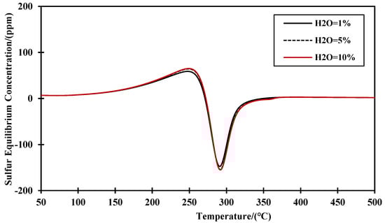 Figure 13 shows the relationship between the equilibrium concentration of sulfur and the temperature at different H2O concentrations. It can be seen from Figure 13 that the peak value of the sulfur equilibrium concentration is 65 ppm and 59 ppm at 10% and 1% of the H2O concentrations, respectively, that differs by 6 ppm. This indicates that the change in H2O concentration has less effect on the equilibrium concentration of sulfur. Thus, the change in H2O concentration has minimal impact on the formation of sulfate.