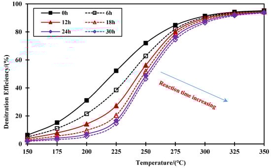 The relationship between the denitration efficiency and the exhaust gas temperature with different reaction times.